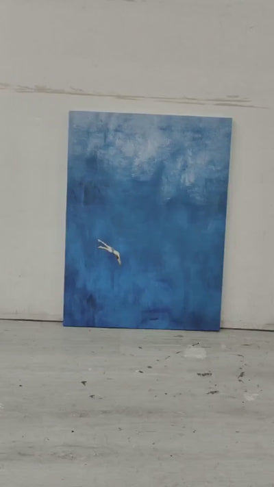 Experience the profound depths of the ocean with "Dive into the Blue," an exquisite original hand-painted oil painting. This artwork features a solitary diver descending into a magnificent expanse of textured indigo and sapphire blue.