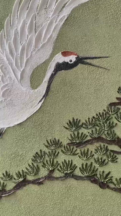 A masterpiece of symbolic grace. This original 3D textured painting features the noble red-crowned crane and ancient pine, symbols of longevity and peace. The sage green impasto background adds a sophisticated botanical touch to luxury Asian-inspired interiors. This one-of-a-kind wildlife masterpiece showcases heavy palette knife work, creating a sculptural effect on canvas. A significant investment-grade artwork for collectors seeking modern bird art with tangible depth.